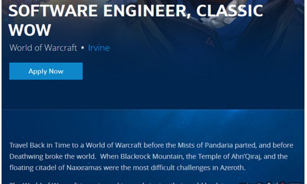 暴雪最近在招聘官网中加入了两个怀旧服的招聘信息,都是招聘软件工程师。招聘信息中写道:“重回潘达利亚之谜之前,回到死亡之翼破碎世界之前,那时候黑石山、安其拉神殿及纳克萨玛斯的浮空要塞就是艾泽拉斯面临的最困难挑战。魔兽团队正在致力于将经典旧世带回给玩家,我们需要软件工程师帮助我们将过去的世界重新带到现在。"