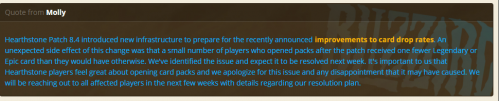 炉石传说8.4号补丁引入了此前我们谈过的新机制,炉石卡包改动。但是,这次改动却带来了一个我们意料之外的副作用,一小部分玩家在本次补丁后开包获得的史诗和传说卡牌变少了。我们已经确定问题,预估将于下周修正。玩家开包的喜悦对我们来说是一件大事,我们就此问题造成的遗憾与不便表示歉意。在这几周,我们会联系所有受到影响的玩家,详细告知补偿方案。