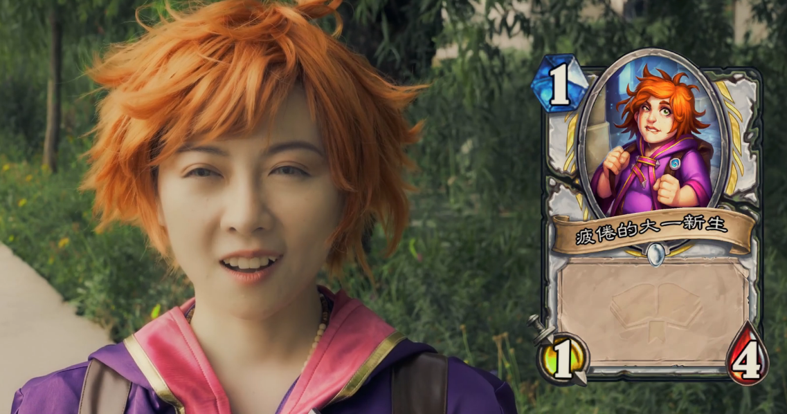 这部视频的整体剧情由一个新生入学展开,为了迎合炉石此前公布的“疲倦的大一新生”这张卡,老皮一改之前又白又大的选角风格,采用了小清新的妹子作为主角。整个剧情可以分为三个阶段。