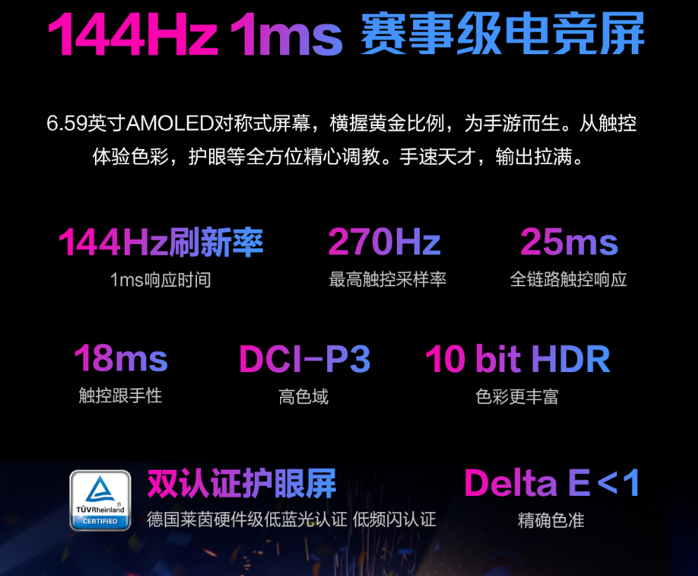 270Hz触控采样率,以及25ms全链路触控响应,滑动触控延时仅为18ms,大幅提高玩家操作速度及跟手性。同时,在色彩和护眼维度上上,ROG游戏手机3支持DCI-P3高色域,色彩精准度Delta E<1,并且支持10 Bit HDR,还获得了德国莱茵硬件级低蓝光护眼认证和低频闪认证,画面呈现逼真自然,护眼的同时,将以前所未有的视觉冲击力强化沉浸式游戏体验。