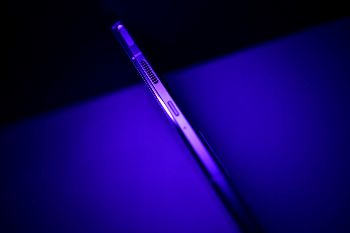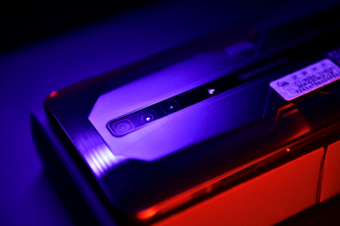 本次拿到的腾讯红魔游戏手机6 Pro为玄铁黑配色,采用红魔创新工艺与多重工序打造的玻璃背板,搭配红魔独有的航空铝合金 -散热冰刃设计,重量适中为220g,持握手感不错,下端红魔logo和左右中部的两个氛围灯条为RGB炫彩灯,可在多种情景下设置独立的灯效和色彩,拥有常亮、呼吸、闪烁、对闪、流动和灯随音动等多种灯效~