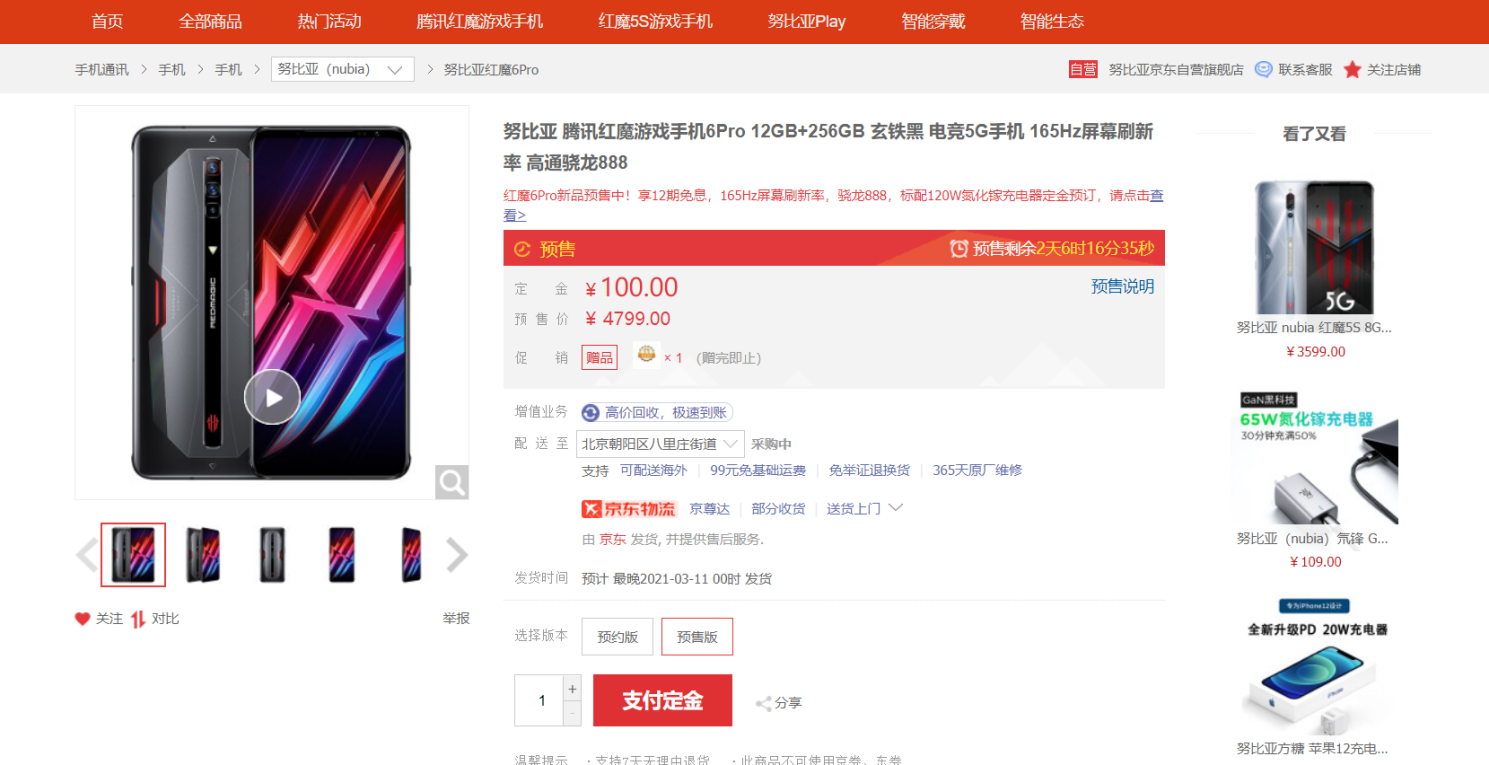 价格方面,腾讯红魔游戏手机6Pro 12+128GB版本售价为4399元,12+256GB版本4799元,16+256GB版本为5299元,红魔6 8+128GB版本的价格为3799元,12+128GB版4099元,12+256GB版本则为4399元,在努比亚官网和努比亚品牌京东旗舰店可以购买。除此之外,此次腾讯红魔游戏手机6 Pro还将推出氘锋透明版,除了采用16+256GB版本外还配备了全球首发18G超大内存,配合512G存储空间组成的业界最强存储配置,其售价分别为5599元和6599。