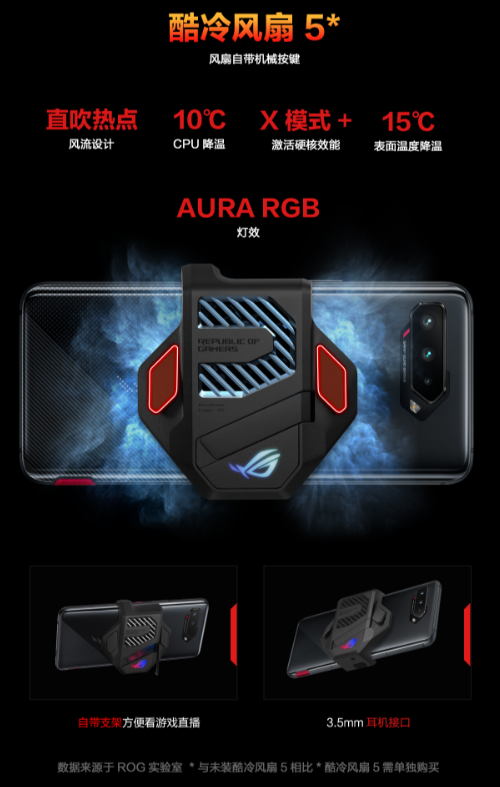 16+512GB的腾讯 ROG游戏手机5 Pro和18+512GB 腾讯ROG游戏手机5幻影,则在手机背面独家设计了双腰键,键位更多,六指战神战力更燃,Pro和幻影版本随机标配酷冷风扇5,加持风扇按键,最多可达到8指操作。同时,幻影还是全球首款配置真18GB运行内存的手机,非虚拟18GB内存可比,是手机性能的又一次里程碑式升级。