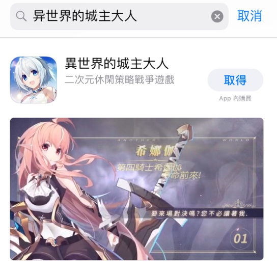 IOS是在AppStore下载,登录港台地区ID后,搜索“异世界的城主大人”,点击“取得”开始下载。