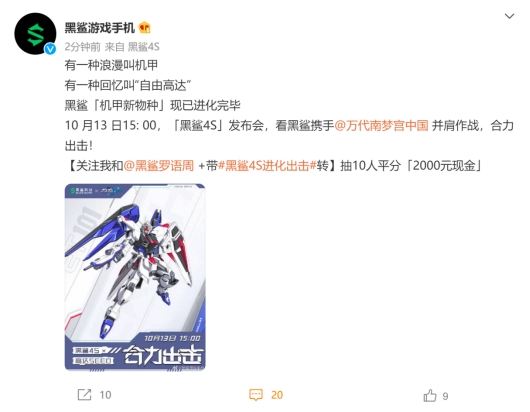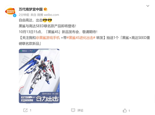 10月8日,黑鲨科技官方正式宣布,全新黑鲨4S系列游戏手机将于10月13日正式发布。今日官方又有新动作,@黑鲨游戏手机 官方微博上午发文“有一种浪漫叫机甲,有一种回忆叫“自由高达”,黑鲨「机甲新物种」现已进化完毕”并@万代南梦宫中国,后者随即回应“自由高达,出击!”