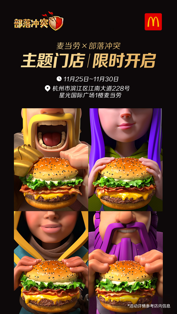 2021《部落冲突》全球锦标赛总决赛即将开战,线下主题店已装修完成!为了让村庄英雄们和首领在赛场上有更好的发挥,我们决定邀请大家,一起品尝麦当劳美味汉堡!《部落冲突》x麦当劳主题店现已登陆杭州滨江江南大道店!