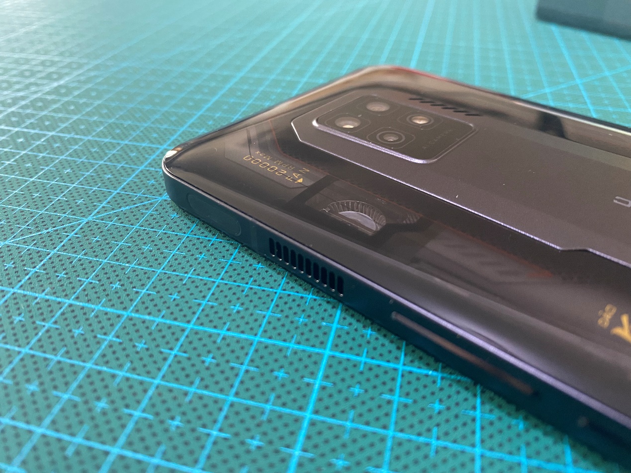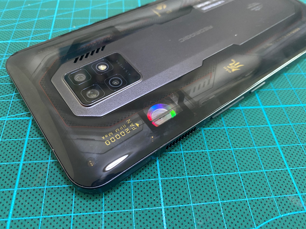 机身A面一如既往继承了红魔系列的设计风格,1080*2400 分辨率,屏幕最高刷新率 120Hz,支持DCI-P3 100%广色域,10bit 色深,DC 调光可降低频闪,第七代屏下指纹技术,支持心率检测。这么多技术融合在一块6.8 英寸 UDC全面屏上,堪称旗舰典范。