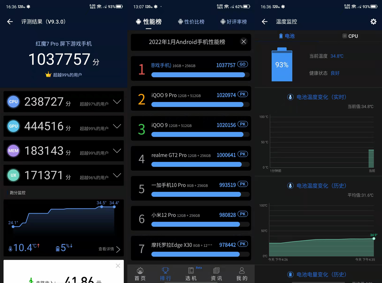 在安兔兔9.3.0版本中,以跑分分数为1037757分傲视群雄,性能排行榜第1名,在开启散热风扇的情况下,外壳触感不足35℃。