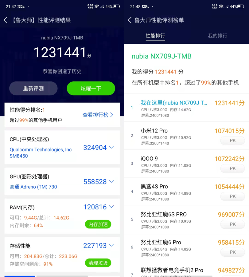 在鲁大师性能测试中,关闭了散热风扇情况下。跑分为1231441分,不出意外的性能排行榜第1名。